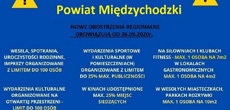Ministerstwo zdrowia zaktualizowało dzisiaj listę powiatów, w których obowiązują dodatkowe obostrzenia w związku ze wzrostem liczby zakażeń na koronawirusa. Lista powstaje na podstawie analiz dynamiki wzrostów zakażeń w ostatnich 14 dniach. Jeśli nowych zachorowań było w tym okresie powyżej 12 na 10 tys. mieszkańców, wtedy powiat trafia do czerwonej strefy, a jeśli między 6 a 12 na 10 tys., to do żółtej. I tak powiat międzychodzki trafił do strafy żółtej.